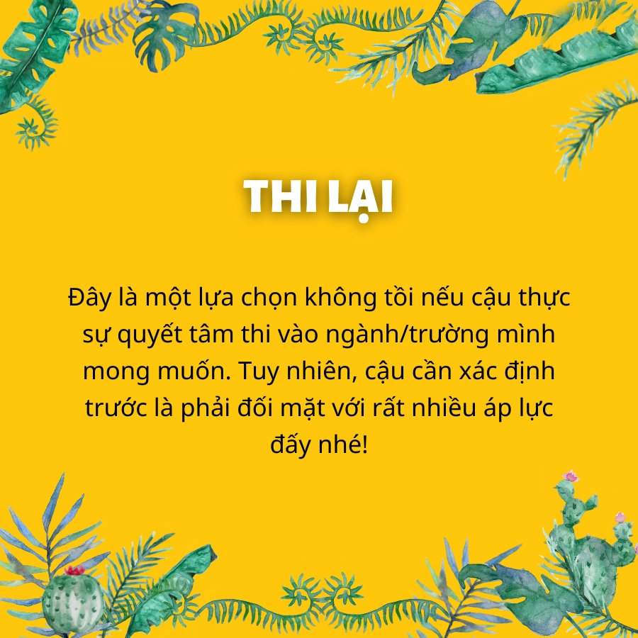 Nếu các bạn vẫn rất mong muốn được đỗ vào ngôi trường mơ ước mà kết quả thi hiện tại không thể đáp ứng được điều đó, bạn có thể nghĩ đến việc ôn thi để năm sau thi lại. Việc bắt đầu học muộn hơn một năm không phải là một vấn đề quá quan ngại, mỗi người đều có một đồng hồ thời gian thành công của riêng mình. Tuy nhiên, nếu lựa chọn ôn thi lại, các thí sinh sẽ cần chuẩn bị tâm lý thật vững vàng cùng quyết tâm cao độ vì quá trình này sẽ rất khó khăn. Em sẽ không có bạn bè xung quanh bên cạnh cùng lấy động lực cùng tiến, cùng ôn thi, không những vậy, việc không phải lên lớp nữa dễ dàng làm cậu mệt mỏi, xao nhãng.