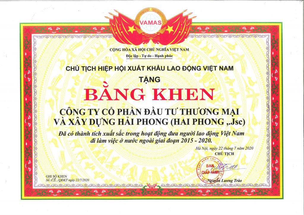 Hải Phong., Jsc nhận bằng khen doanh nghiệp phái cử nhân lực có thành tích xuất sắc giai đoạn 2015 -2020