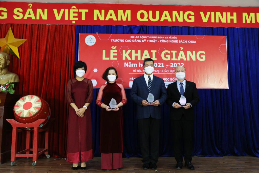 Buổi lễ có sự tham dự của ban giám hiệu cùng các thầy cô giáo, đại diện các doanh nghiệp hỗ trợ học bổng cho tân sinh viên CTECH có thành tích xuất sắc trong kỳ tuyển sinh năm học 2021 – 2022, và được phát trực tuyến trên Fanpage Cao đẳng Kỹ thuật – Công nghệ Bách Khoa.
