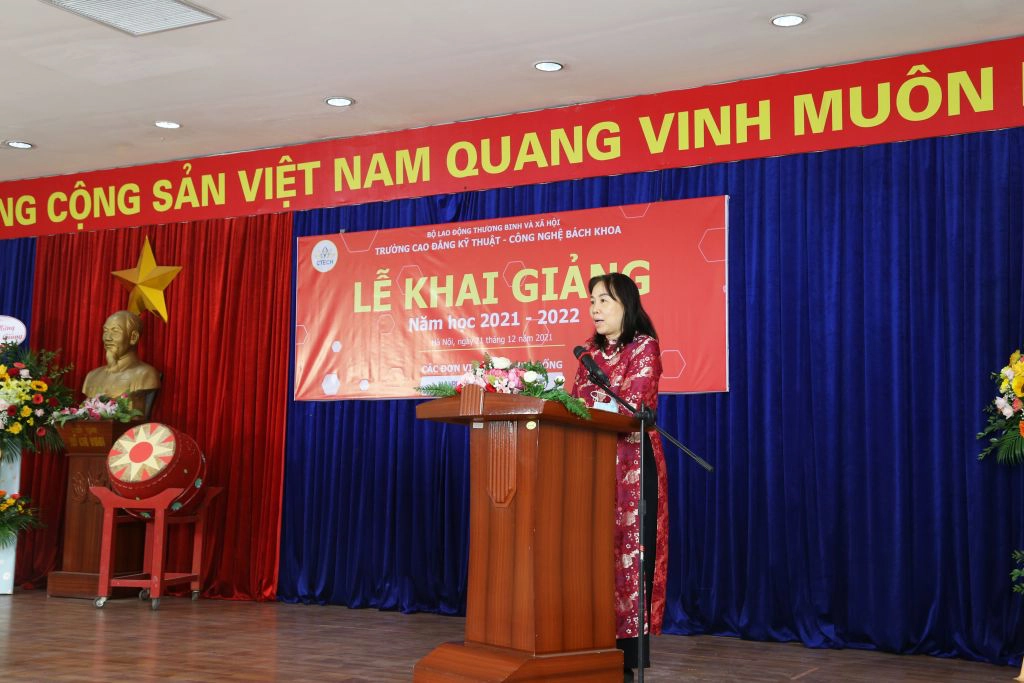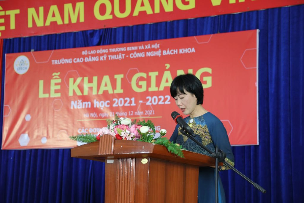 Tiến sĩ Lê Kim Dung, Hiệu trưởng Trường CĐ Kỹ thuật - Công nghệ Bách Khoa, phát biểu tại buổi lễ khai giảng.