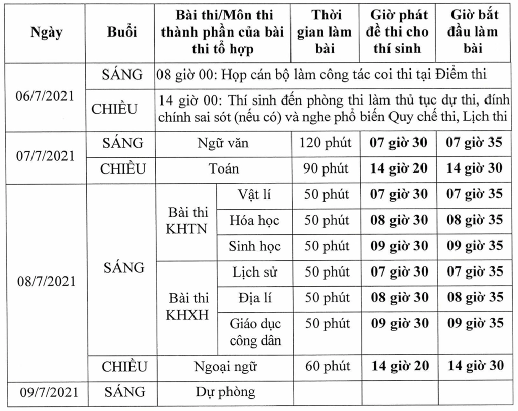 Thí sinh sẽ đến phòng thi làm thủ tục vào chiều 6/7. Ngày 7/7, thí sinh làm bài hai môn Ngữ văn và Toán. Các em làm bài thi tổ hợp và Ngoại ngữ vào ngày 8/7. Thời gian cụ thể như sau: