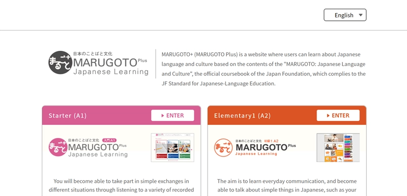 Marugoto Plus là trang web học tiếng Nhật online tại nhà miễn phí tốt nhất hiện nay, với giao diện web vô cùng bắt mắt và thu hút, cung cấp giáo trình Marugoto – Ngôn ngữ và Văn hóa Nhật Bản" được Quỹ giao lưu quốc tế Nhật Bản khai thác dựa trên Tiêu chuẩn giáo dục tiếng Nhật JF giúp bạn học tập, cải thiện và nâng cao về ngôn ngữ Nhật một cách tốt nhất.