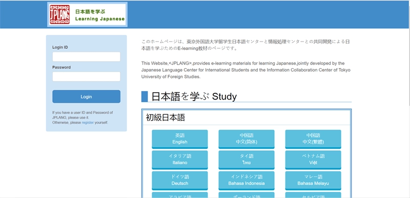 Tiếng Nhật JPlang là trang web học tiếng Nhật trực tuyến rất nổi tiếng và được cung cấp bởi trường Đại học Ngoại ngữ Tokyo (Tokyo University of Foreign Study), với nội dung sinh động đa hình ảnh, âm thanh, tương tác giúp bạn quên đi cảm giác học nhàm chán, khó hiểu, bạn sẽ nhanh tiếp thu và nắm vững kiến thức hơn rất nhiều.