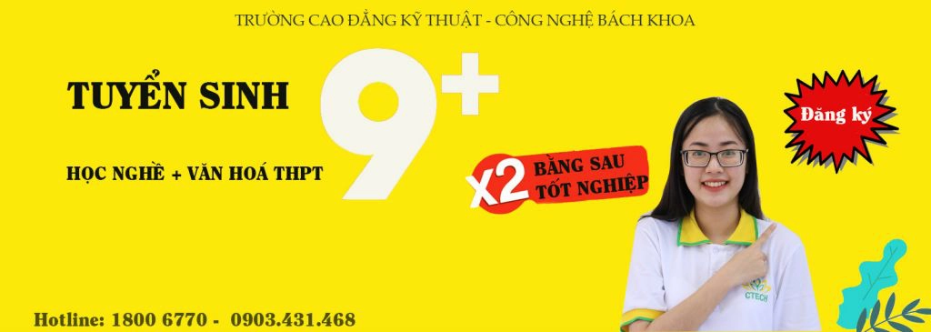 Trường Cao đẳng Kỹ thuật - Công nghệ Bách Khoa (CTECH) tuyển sinh năm học 2022 – 2023 hệ 9+. Sau 3 năm có 2 bằng (tốt nghiệp THPT, bằng Trung cấp – Chính quy). Miễn phí học nghề theo quy định. Cam kết 100% cơ hội việc làm cho học sinh sau khi tốt nghiệp.